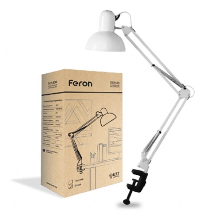 Описание Настольный светильник Feron DE1430 на струбцине под лампу Е27 Белый