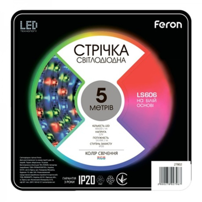 Світлодіодна стрічка Feron SANAN LS606 60SMD / м 12V IP20 RGB — це інноваційний та надійний джерело освітлення від українського виробника Feron Україна. Цей продукт відзначається високою якістю, енергоефективністю та надзвичайно довгим терміном служби.